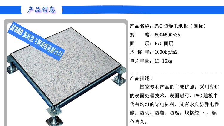 PVC全鋼高架地板 產品型號: 2.00MMPVC全鋼高架地板 規格: 600×600×35㎜ 產品說明: 永久性防靜電PVC地板是一種彈性均質的氯乙烯地面材料,其內部的PVC顆粒表面有一層導...