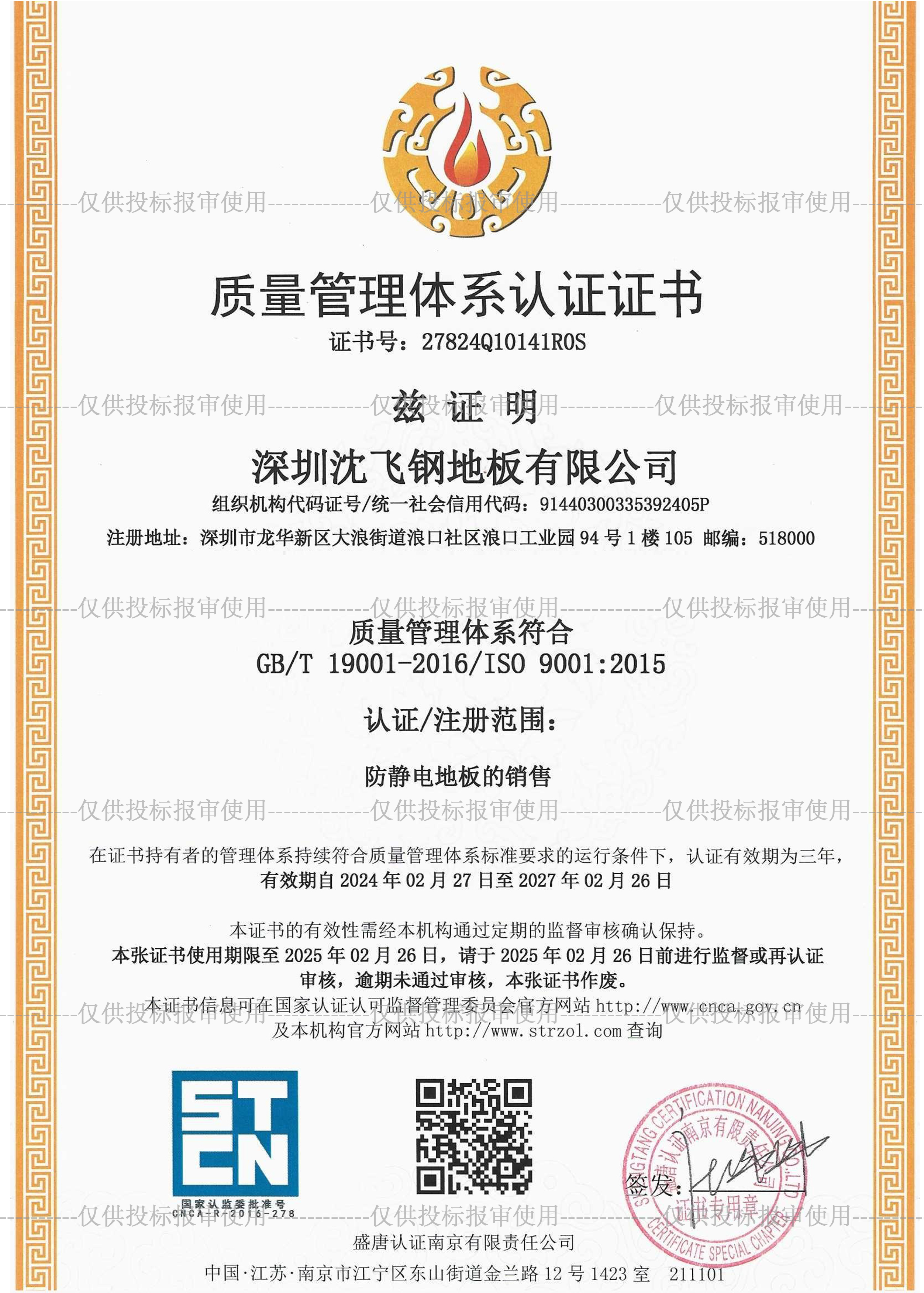 注:以上證書為深圳沈飛鋼地板有限公司所有,未經允許不能復制修改作為其它使用,造成企業損失本公司有權追究相關法律責任